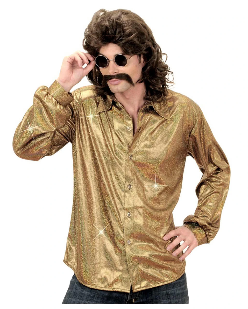 Mit dem 80s Glitzer Discohemd in gold bist du ideal als Pop & Schlager-Star verkleidet und kannst es auf dem Showbühne brodeln lassen. Sorge mit dem Glanz des schimmernden Herrenhemds an Fasching, auf 70s & 80er Jahre Themenpartys und Bad Taste Party für Aufsehen.