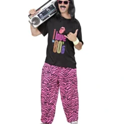 Das 80s Herren Kostüm liefern wir dir mit einer pink-schwarzen Trainingshose im Zebra-Muster sowie einem schwarzen T-Shirt mit der bunten Aufschrift „i love the 80´s“ & einer Rocker-Lippe mit Zunge in rot. Kombiniere noch die Vokuhila Herren Perücke schwarz, den Schnurrbart Albert Einstein schwarz & die Atzen Brille Neonpink & du bist der Partyknaller an Fasching!