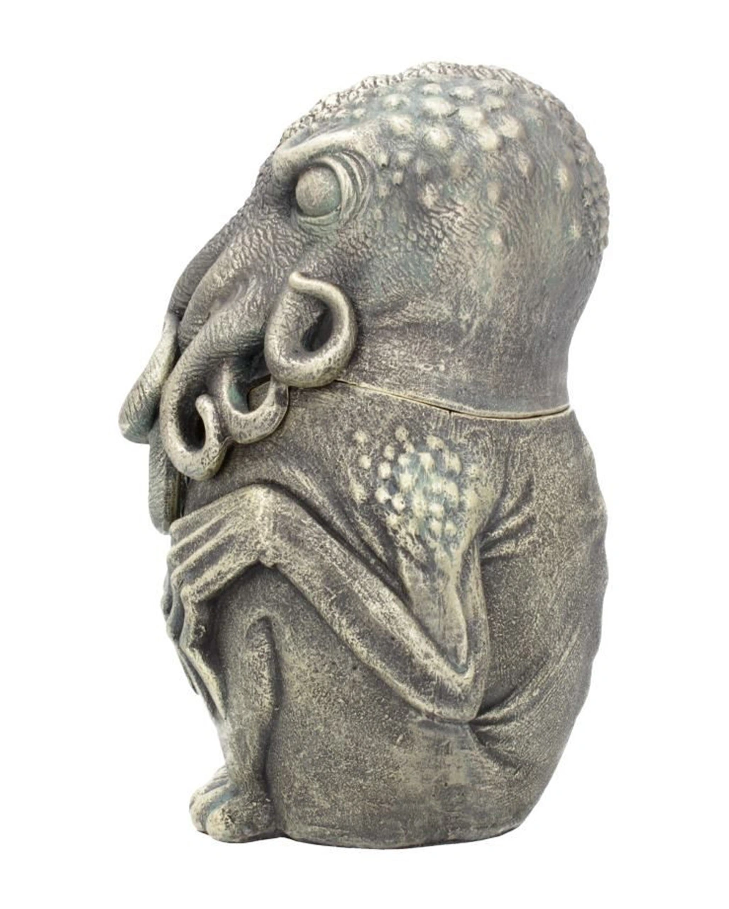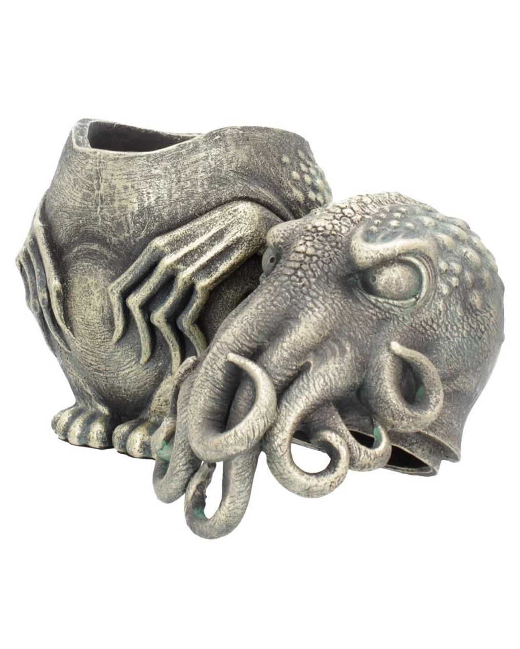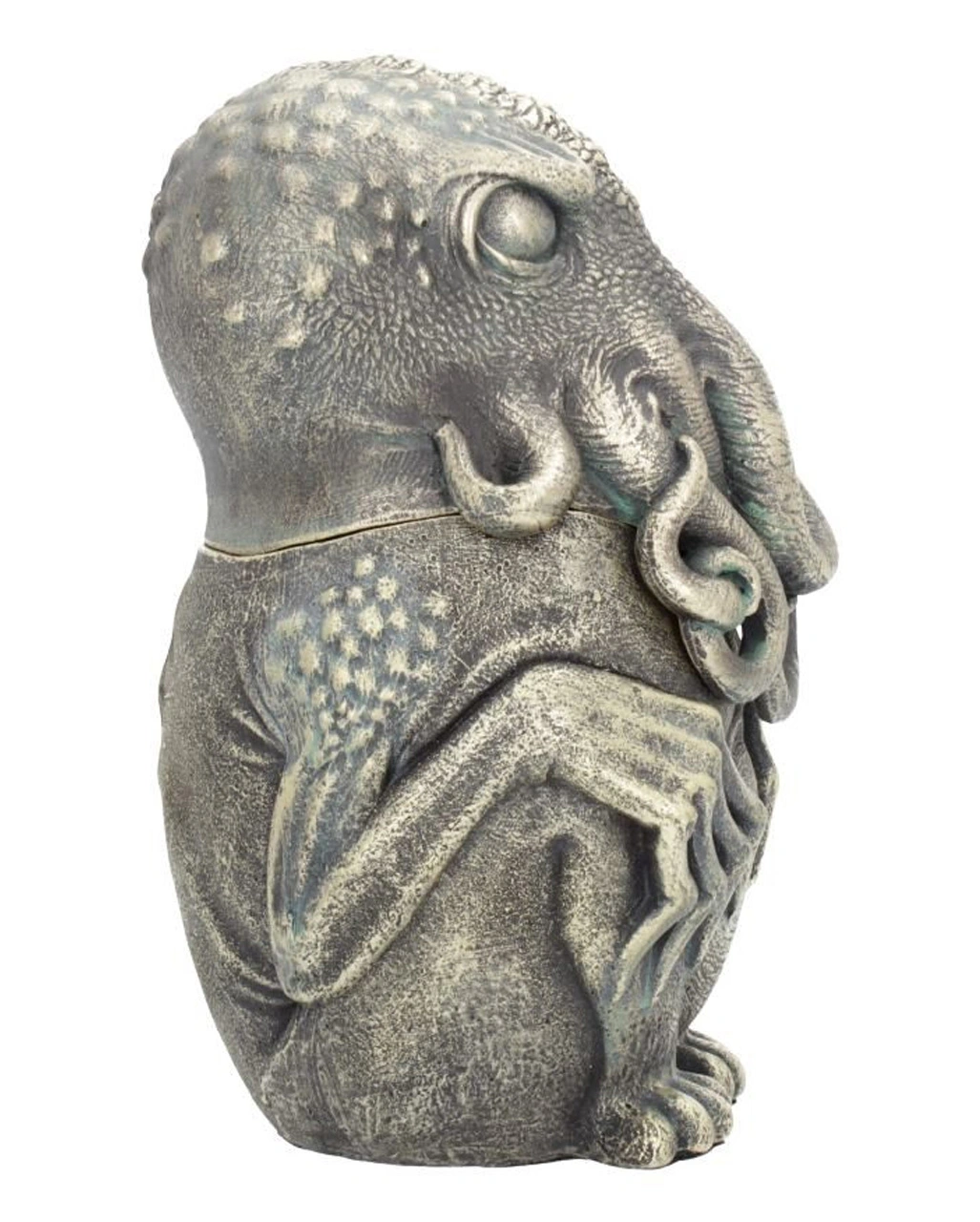 In unserer Version sieht man Cthulhu in einem eher kindlichen Zustand, wie er mit seinen langen, dünnen Fingern seine Knie umklammert. Er starrt bedrohlich, während sich seine Tentakel bis zu seinem Oberkörper krümmen und winden. Gegossen aus feinstem Polyresin und anschließend handbemalt, befindet sich im Inneren dieser Figur ein verstecktes Fach, das man findet, wenn man seinen Kopf abnimmt. Der perfekte Ort, um deine Schätze aufzubewahren! Noch mehr Cthulhu-Accessoires und Fanartikel wie den Cthulhu Weinkelch und den Cthulhu Kissen Bezug KILLSTAR haben wir ebenfalls im Karneval-Universe.de!