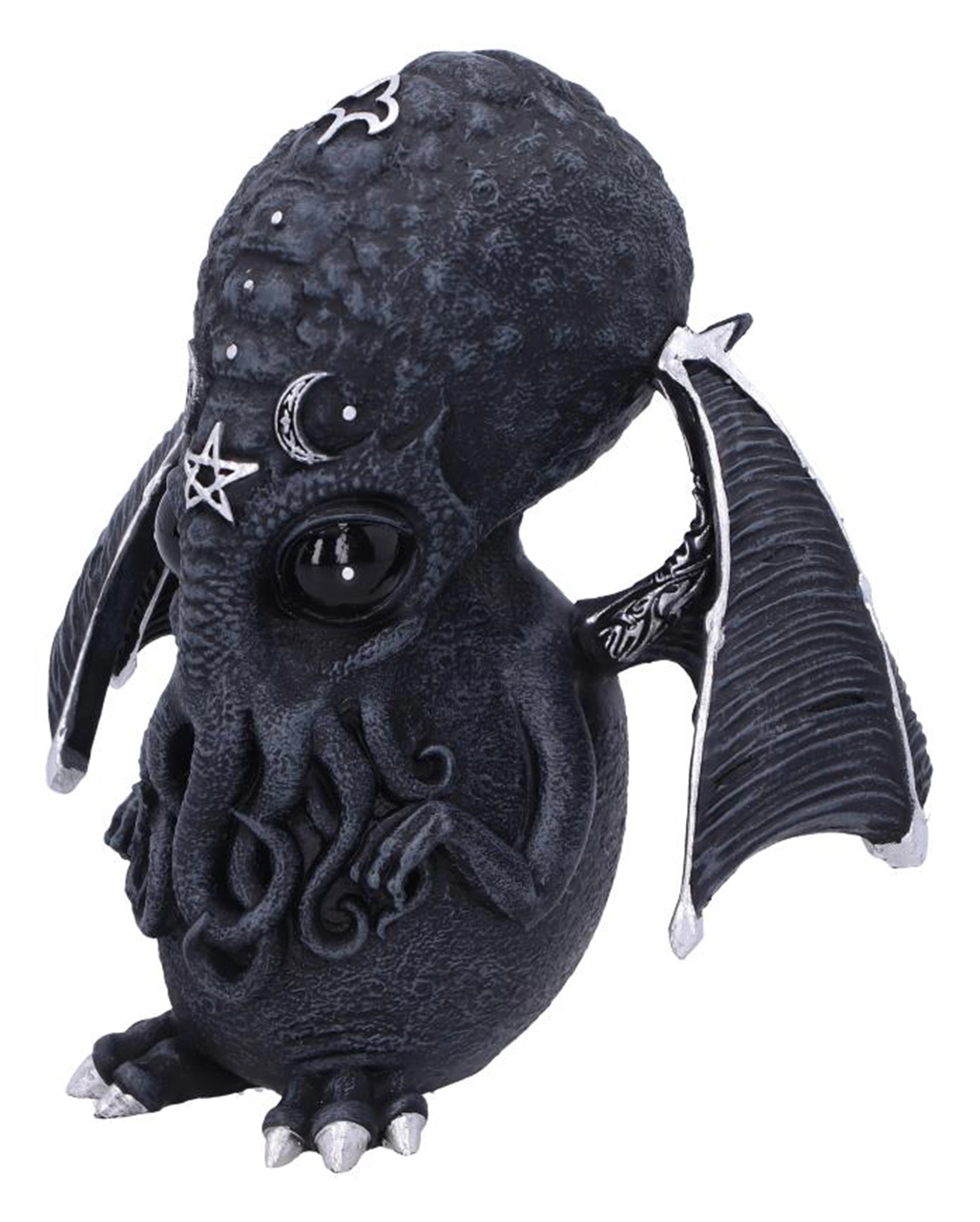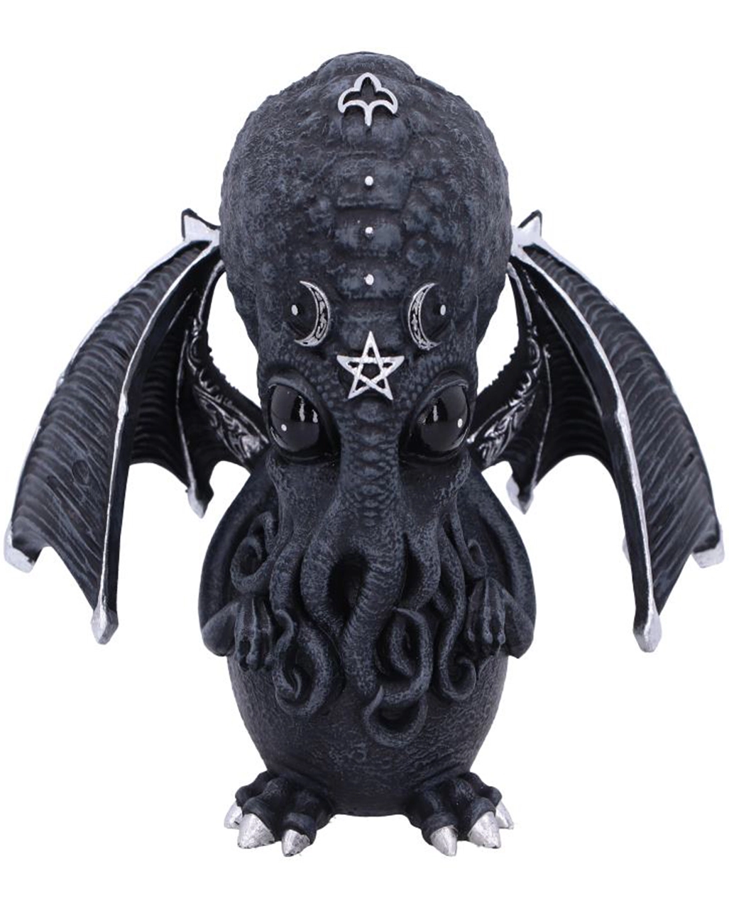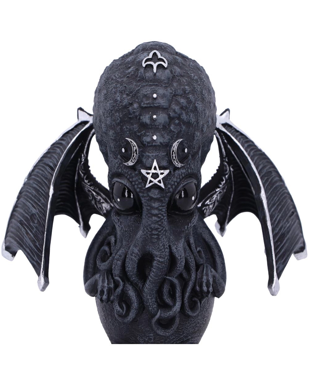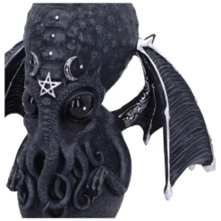Entdecke mit Cthulhu die Welt der Mysterien, und huldige dem Schriftsteller H.P. Lovecraft. Diese eindrucksvoll gestaltete Culthulhu Statue mit Flügeln ist ein echter Hingucker auf dem Tisch oder Fenstersims. Cthulhu ähnelt einer menschlichen Krake mit schwimmhaut-ähnlichen Armen und Beinen. Mit seinen abstehenden Flügeln und den okkulten Details erinnert er an die Geister eines Vampirs.