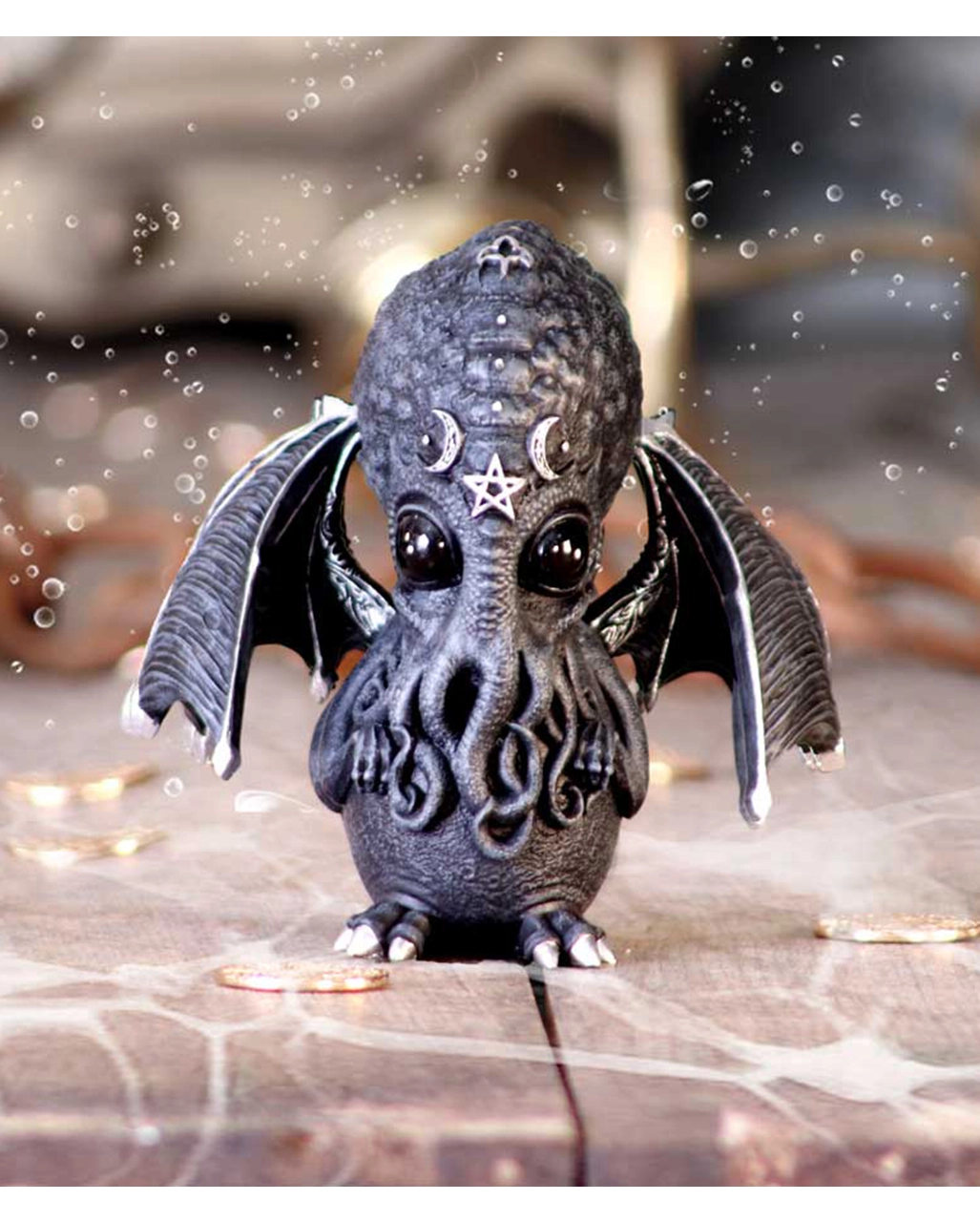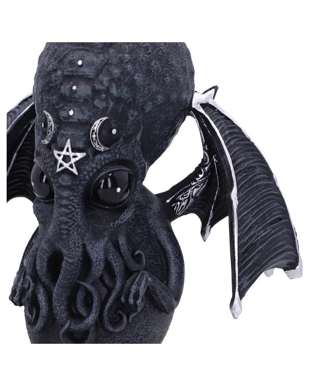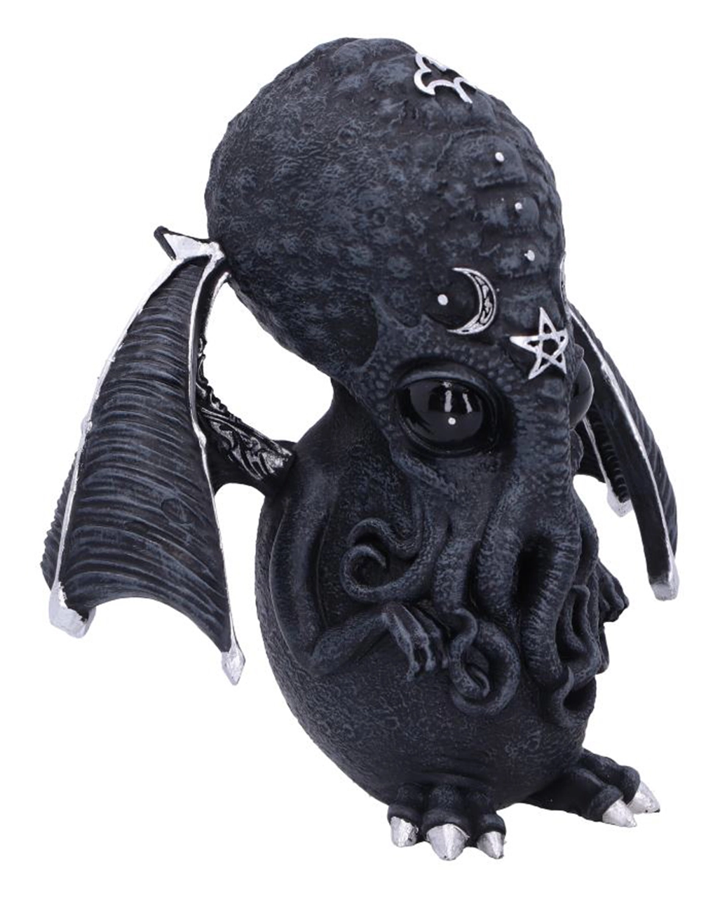 Entdecke mit Cthulhu die Welt der Mysterien, und huldige dem Schriftsteller H.P. Lovecraft. Diese eindrucksvoll gestaltete Culthulhu Statue mit Flügeln ist ein echter Hingucker auf dem Tisch oder Fenstersims. Cthulhu ähnelt einer menschlichen Krake mit schwimmhaut-ähnlichen Armen und Beinen. Mit seinen abstehenden Flügeln und den okkulten Details erinnert er an die Geister eines Vampirs.