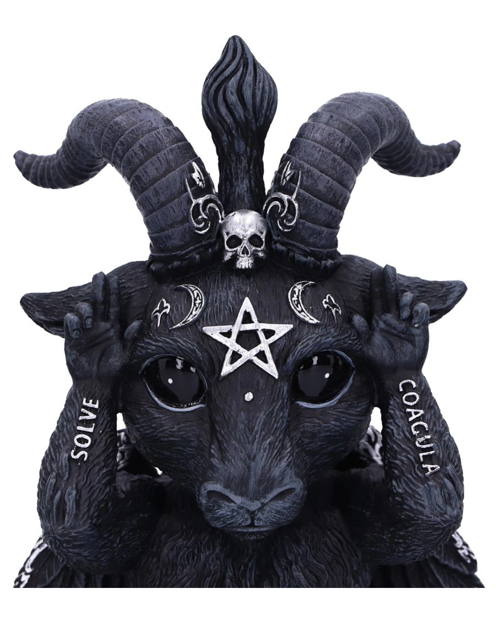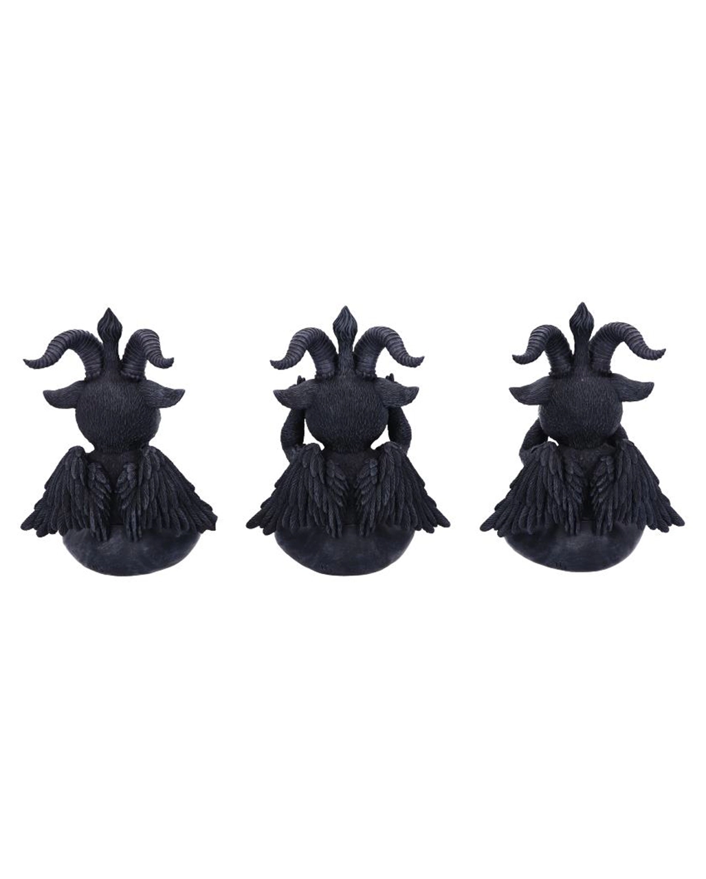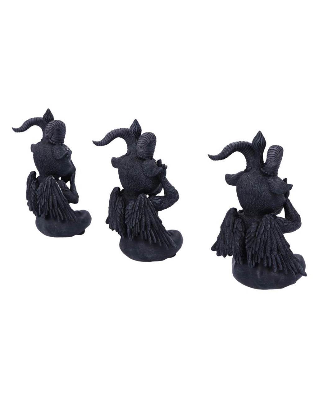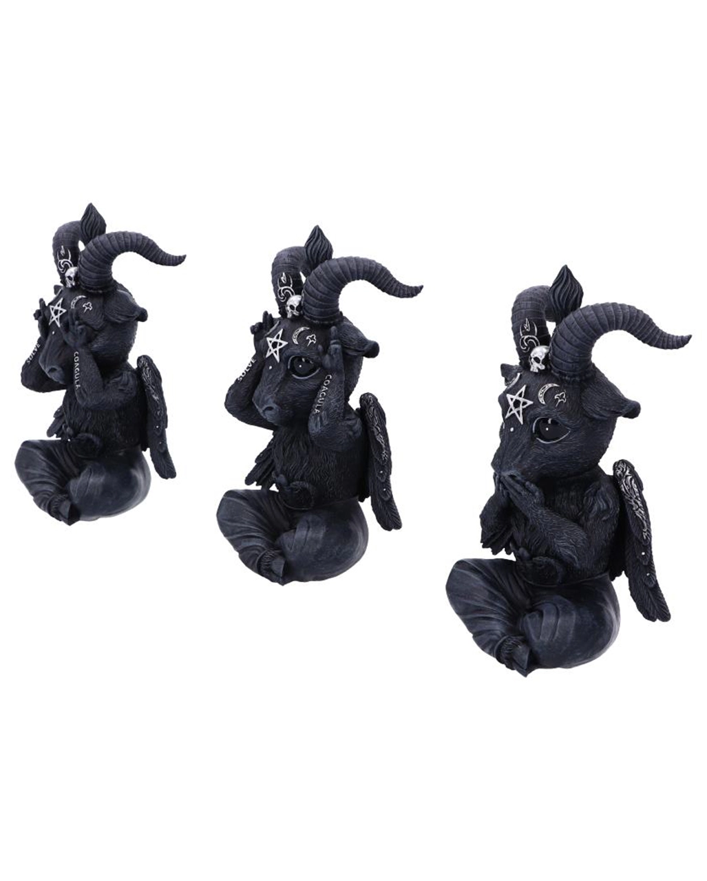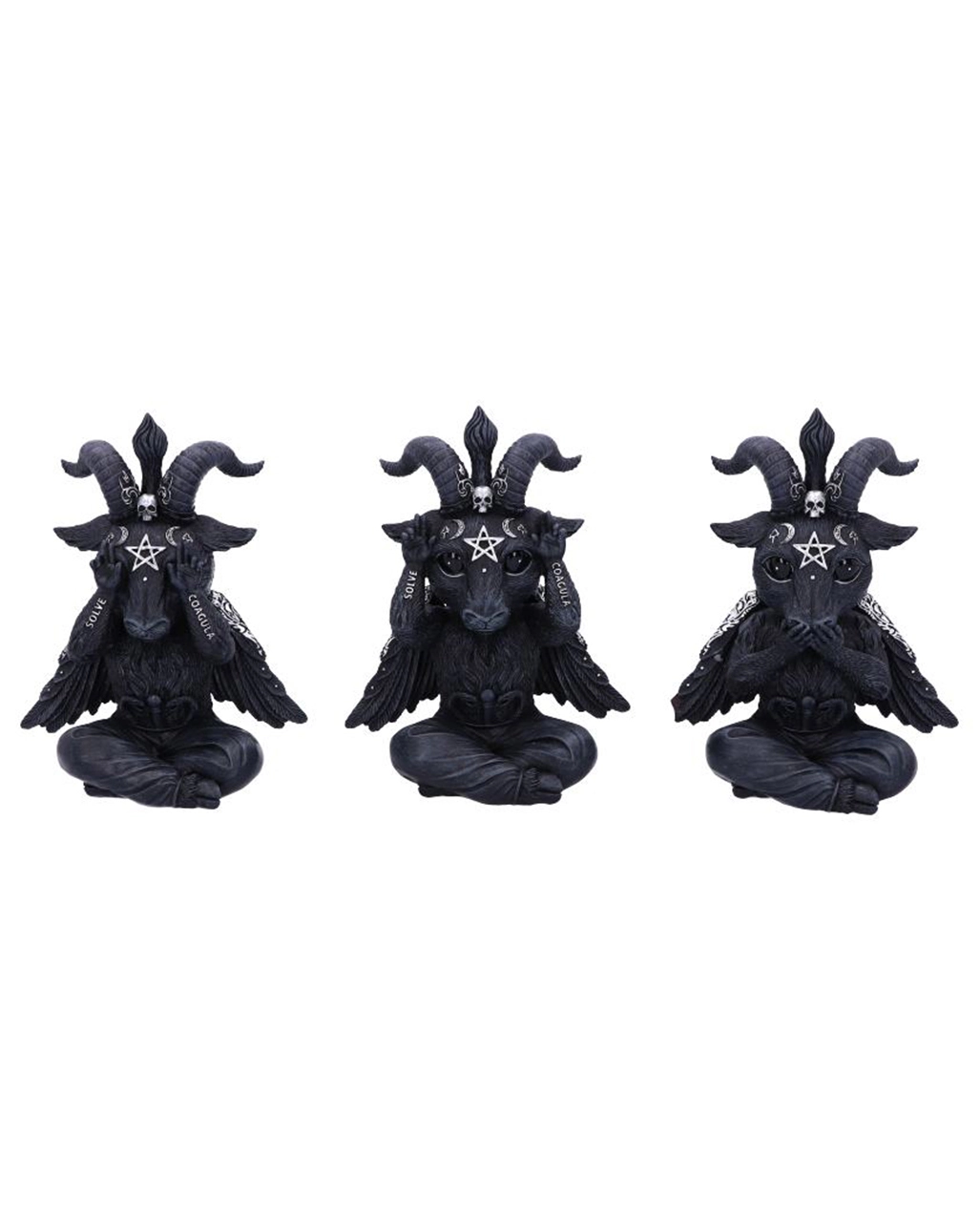 Unsere drei weisen Baphomet Figuren erinnern dich stets an Konfuzius´ Analekten: „Sieh nichts Böses, höre nichts Böses und sprich nichts Böses“. Das Baphomet 3er Set trägt die lateinischen Worte SOLVE und COAGULA sowie ein silbernes Pentagramm auf der Stirn. Eine Figur hält sich die Augen zu, eine andere hält sich den Mund zu und die dritte Baphomet Figur hält sich die Ohren zu. Befolge auch du die Weisheiten des guten Konfuzius und sichere dir dieses einzigartige Baphomet Statuen-Set.Â