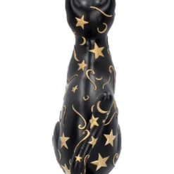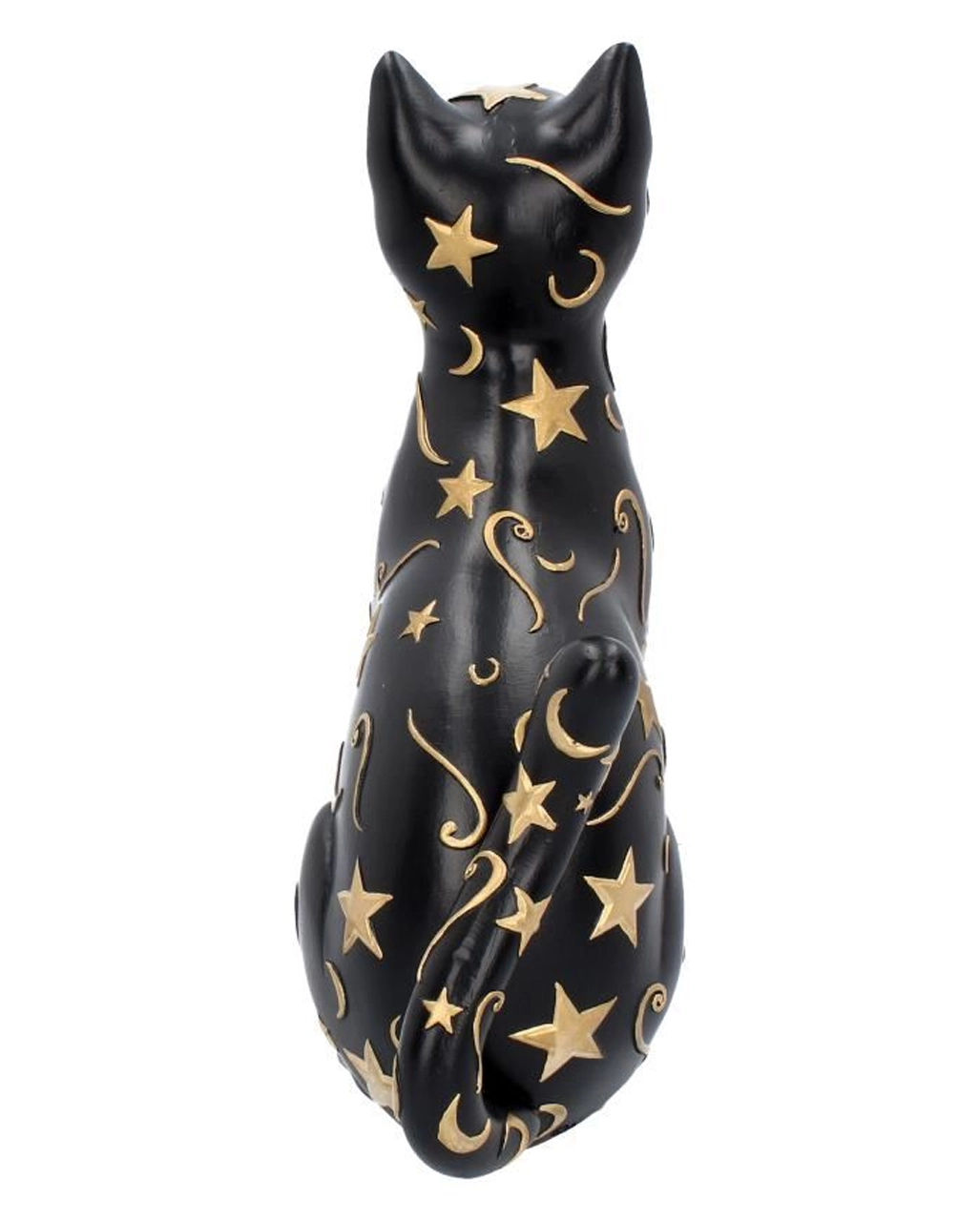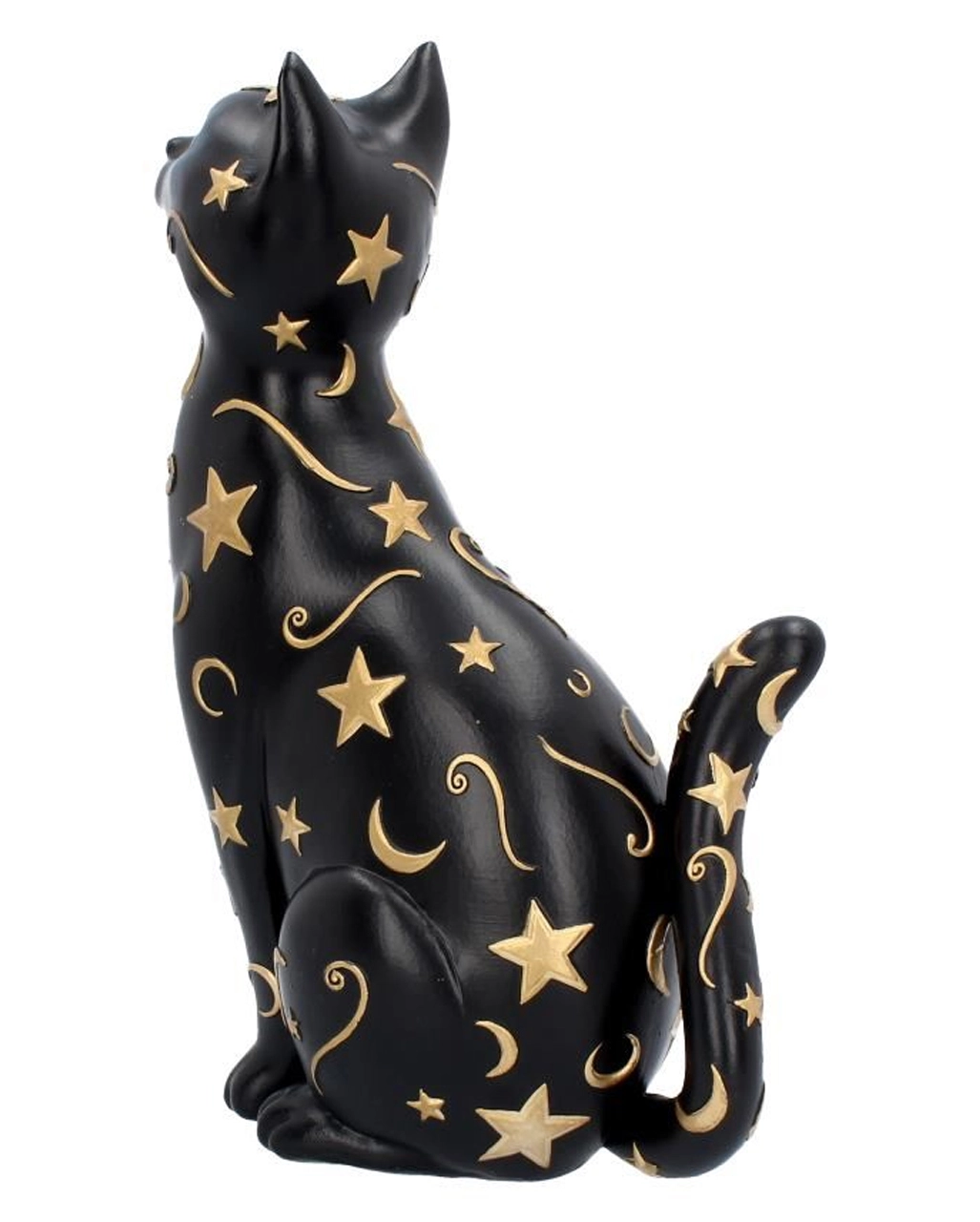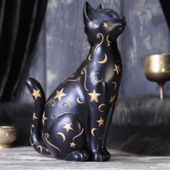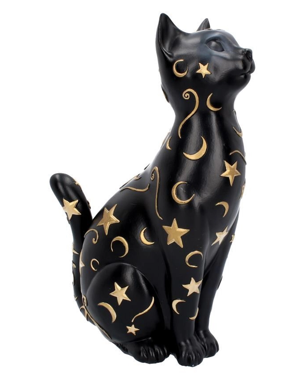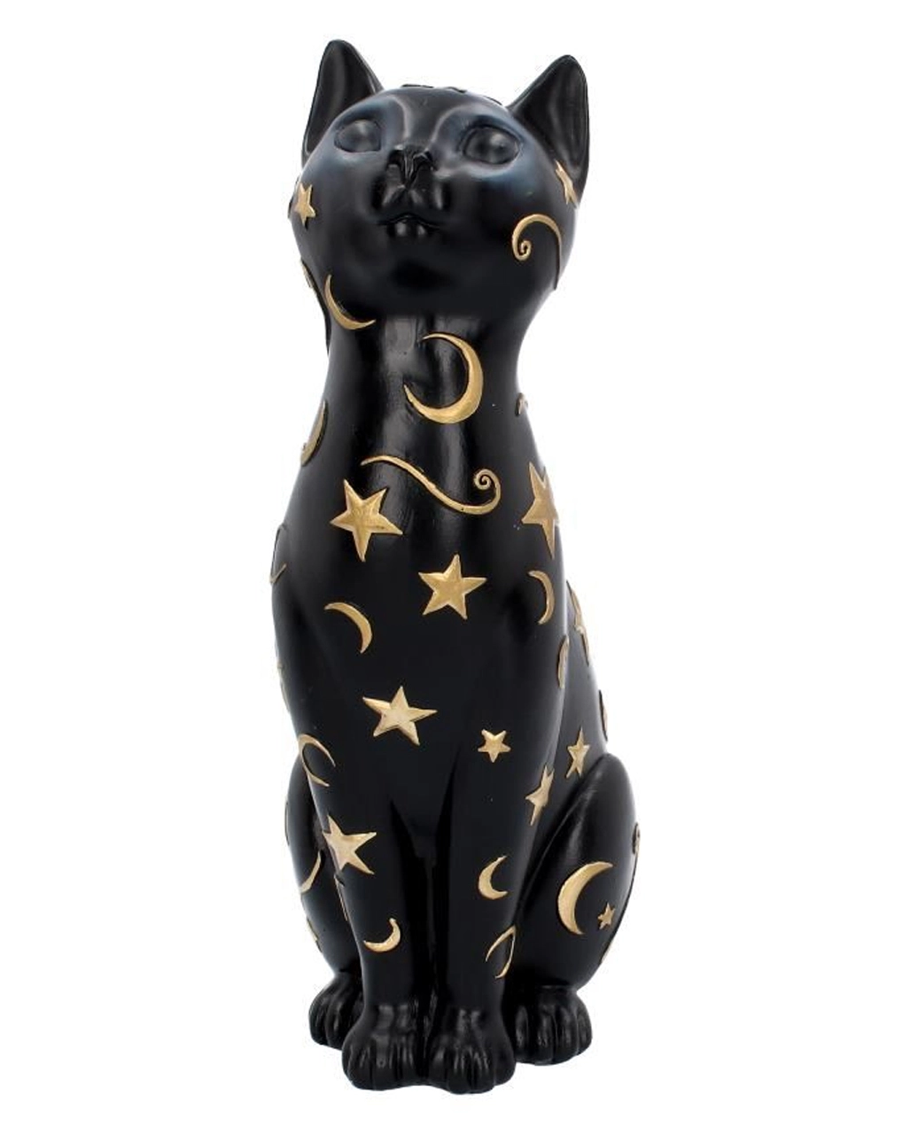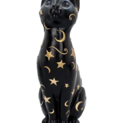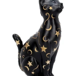 Die aus Kunststein gegossene und handbemalte Gothic Katze ist ca. 26 cm hoch und ein mystischer Blickfang. Auf dem schwarzen Fell sind goldene Himmelsobjekte aufgemalt. Das Tier wirkt edel und mystisch, sodass es sich perfekt in deiner Gruft macht. Entdecke noch mehr Katzenfiguren wie die Hexen Vertrauter auf Halbmond Figur 21,2cm