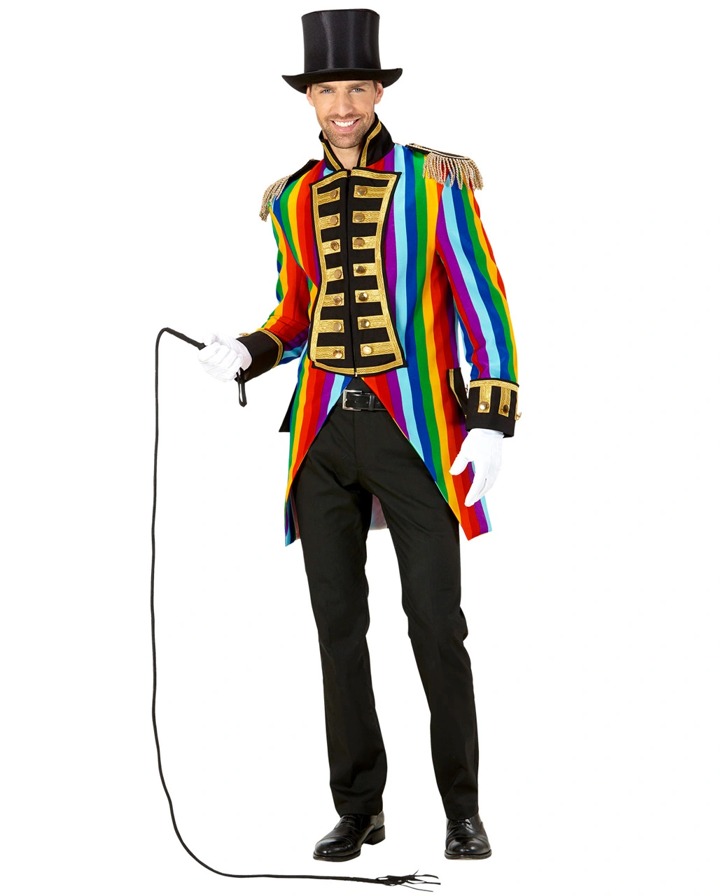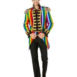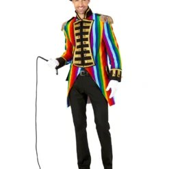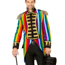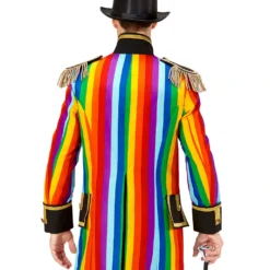 Du bekommst den Gay Pride Parade Herrenfrack als stilvolles Kostümzubehör für Fasching- & Paradekostüme. Der bunt-goldene Militär Frack ist in S-XL Größe verfügbar und wirkt durch seine goldenen Applikationen und Zierknöpfe besonders hochwertig. Ein buntes Regenbogenmuster im All-over Print bildet hierzu einen schönen Kontrast. Mit einer schwarzen Stoffhose lässt sich die venezianische Kostümjacke ebenfalls perfekt tragen. Unser Zylinder schwarz Gr. 58 ist passend zum bunten Streifenfrack und ist universell einsetzbar.