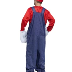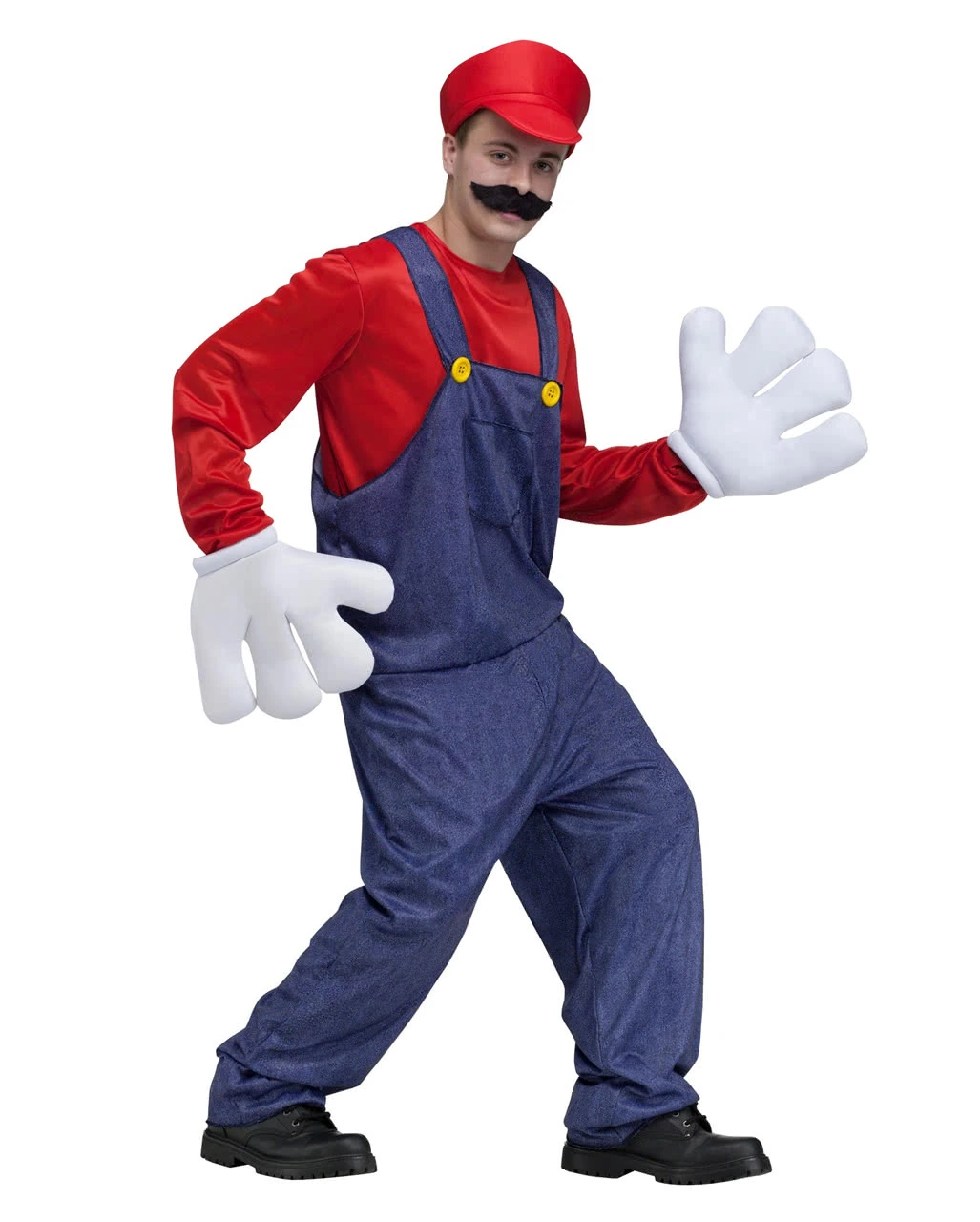 Das Kostüm Videospiel Klempner 1 besteht aus Shirt, Blaumann, Handschuhen, Mütze und Bart. Über das feuerrote Shirt wird die blaue Latzhose für den charakteristischen Handwerker-Look gezogen. Eine rote, angenehm zu tragende Schirmmütze auf dem Kopf und übergroße, weiße Cartoon-Hände mit je vier Fingern erzeugen sofort die typische Spielkonsolen-Optik. Abgerundet wird die witzige Faschings-Verkleidung durch einen mächtigen Schnauzer zum Ankleben. Dazu passen die Maske Super Mario und die Riesen Rohrzange.