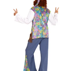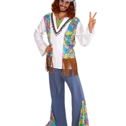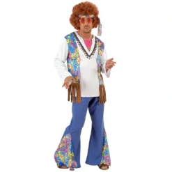 Hippies – der Summer of Love, Flower Power, das Musical Hair und Woodstock, das legendäre Musikfestival. Das Hippie Männer Kostüm besteht aus einem weißen Tunikahemd das am Kragen ein Zierband mit Münzen aufgenäht hat, einer blauen Stoffhose mit buntgeblümten Stoffeinsatz, einer buntgeblümten Weste mit Kunstlederfransen im Wildlederlook und dem passenden buntgeblümten Stirnband.