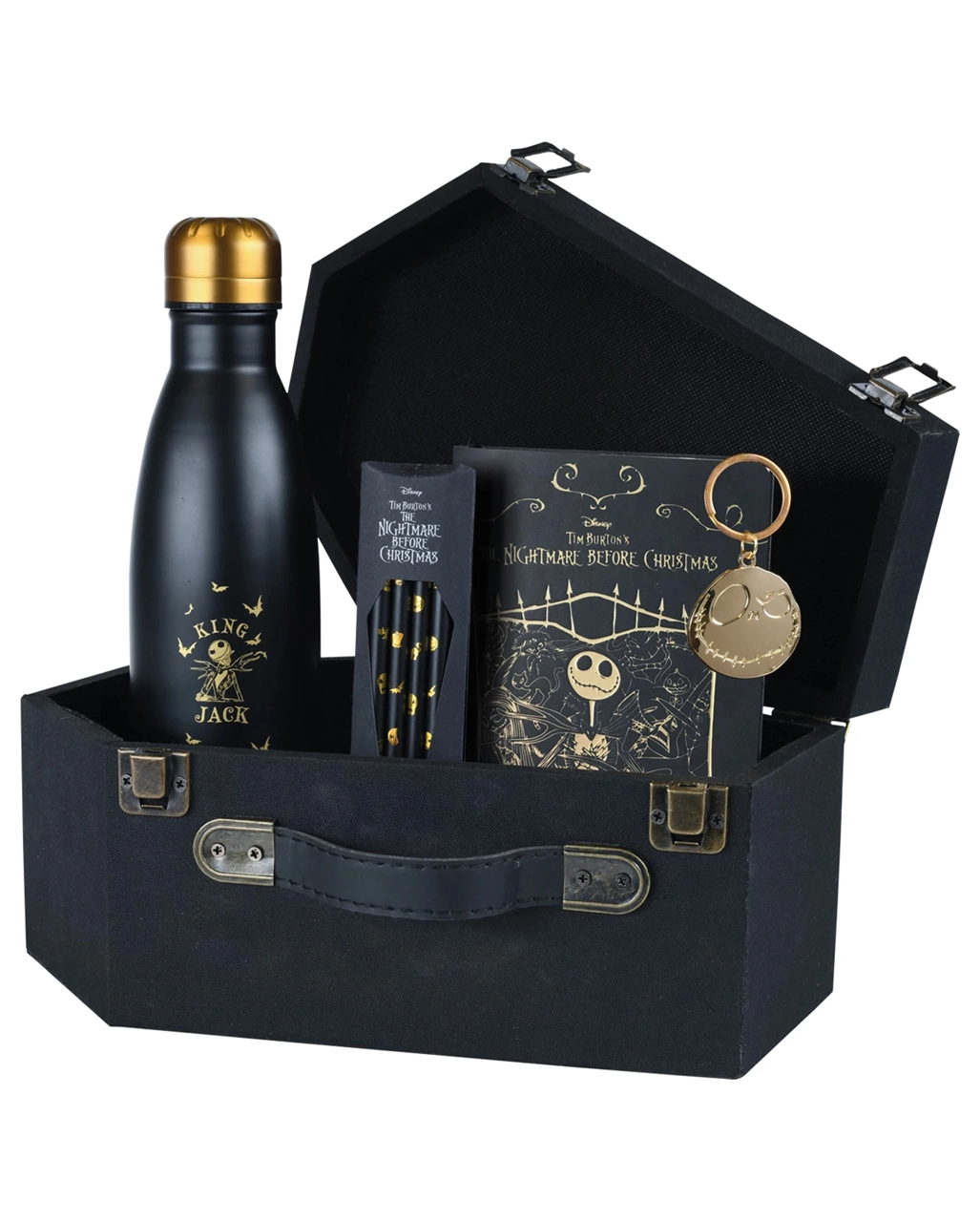 Die Nightmare Before Christmas Geschenkbox in Sargform ist eine geniale Geschenkidee. Das beliebte the Nightmare Before Christmas Accessoire besteht gleich aus mehreren tollen Fanartikeln. Da wäre zunächst der schwarz-goldene Koffer, auf dem Jack Skellington höchstpersönlich prangt. Darin enthalten ist ein A5 Notizbuch, 4 Bleistifte und eine verschließbare Trinkflasche. Der goldig glänzende Schlüsselanhänger komplettierte das Paket voller schaurig schöner the Nightmare Before Christmas & Jack Skellington Merchandise Artikel.