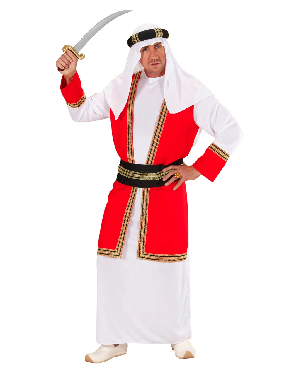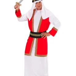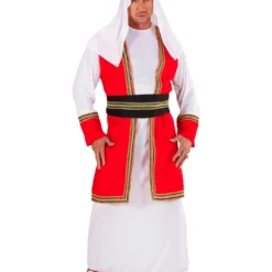 Zum Orientalischer Prinz Kostüm gehören eine Tunika, ein Gürtel und eine Kopfbedeckung. Der weißen Tunika wurde eine rote Weste angenäht, die ähnlich dem schwarzen Gürtel und dem Kopftuch mit zarten, goldenen Stickereien geschmückt wurde. Diese Verzierungen sorgen für die geheimnisvolle, arabische Stimmung des Morgenland Prinz Kostüms, aber du kannst den mysteriösenAnblick deines neuen Araberprinzen Kostüm mit einem alten Teppich und einer Dschinn Wunderlampe erhöhen.