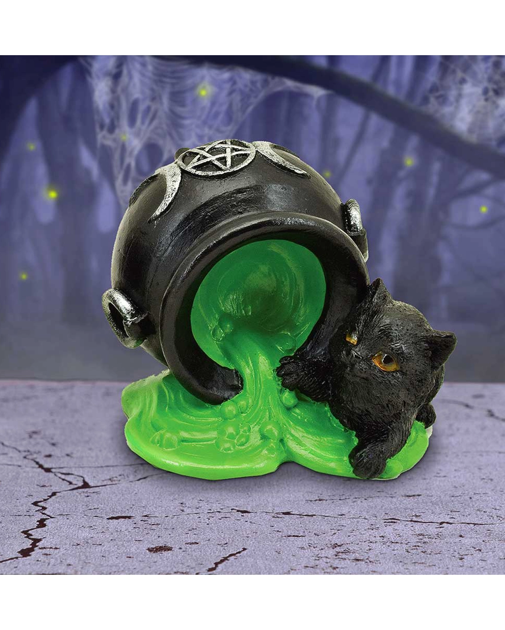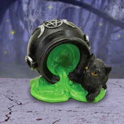 Besitze jetzt als Halloween und Katzenliebhaber die süße Halloween-Tischdekoration einer schwarzen Katze, die aus Versehen einen Hexenkessel mit neongrünem Zaubertrank umgeschüttet hat. Oje, was wird die Hexe und der Magier wohl sagen, wenn diese wieder von ihrem Zauberlehrgang zurückkommen?