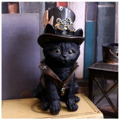 Unsere Samtpfote hat sich einen Hut angezogen und sitzt auf ihrem Hinterteil. Der Zylinder ist mit Uhrwerken, Federn und Zahnrädern geschmückt und ihre spitzen Ohren blitzen durch die Hutkrempe hervor. Um ihren Oberkörper trägt die schwarze Steampunk Katze mit Zylinder eine braune Lederweste mit steifem, hohen Kragen. Diese einzigartige Dekofigur könnte bald schon in deinem Fan-Regal zur Geltung kommen.