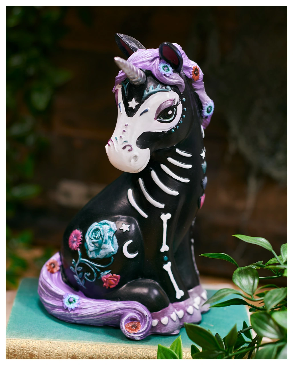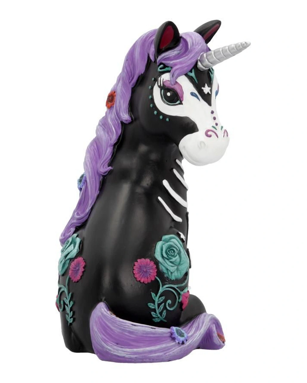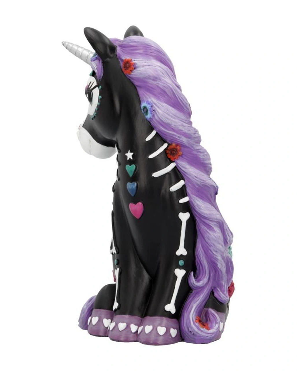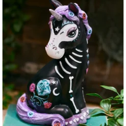 Unser Schwarzes Skelett Einhorn 22cm ist eine hochwertige Sammelfigur aus Polyresin. Sie ist ca. 22 cm hoch und macht sich super als süße Halloween Deko, die man gerne länger ansieht. Der schwarze Einhorn Körper ist von Hand bemalt worden. Man sieht das angedeutete weiße Skelett des Deko Unicorns und weitere zauberhafte Details wie die Herzen auf den violetten Hufen. Das schwarze Einhorn im Calavera Tattoo Look eignet sich ideal als Geschenk für alle Day of the Dead Fans.