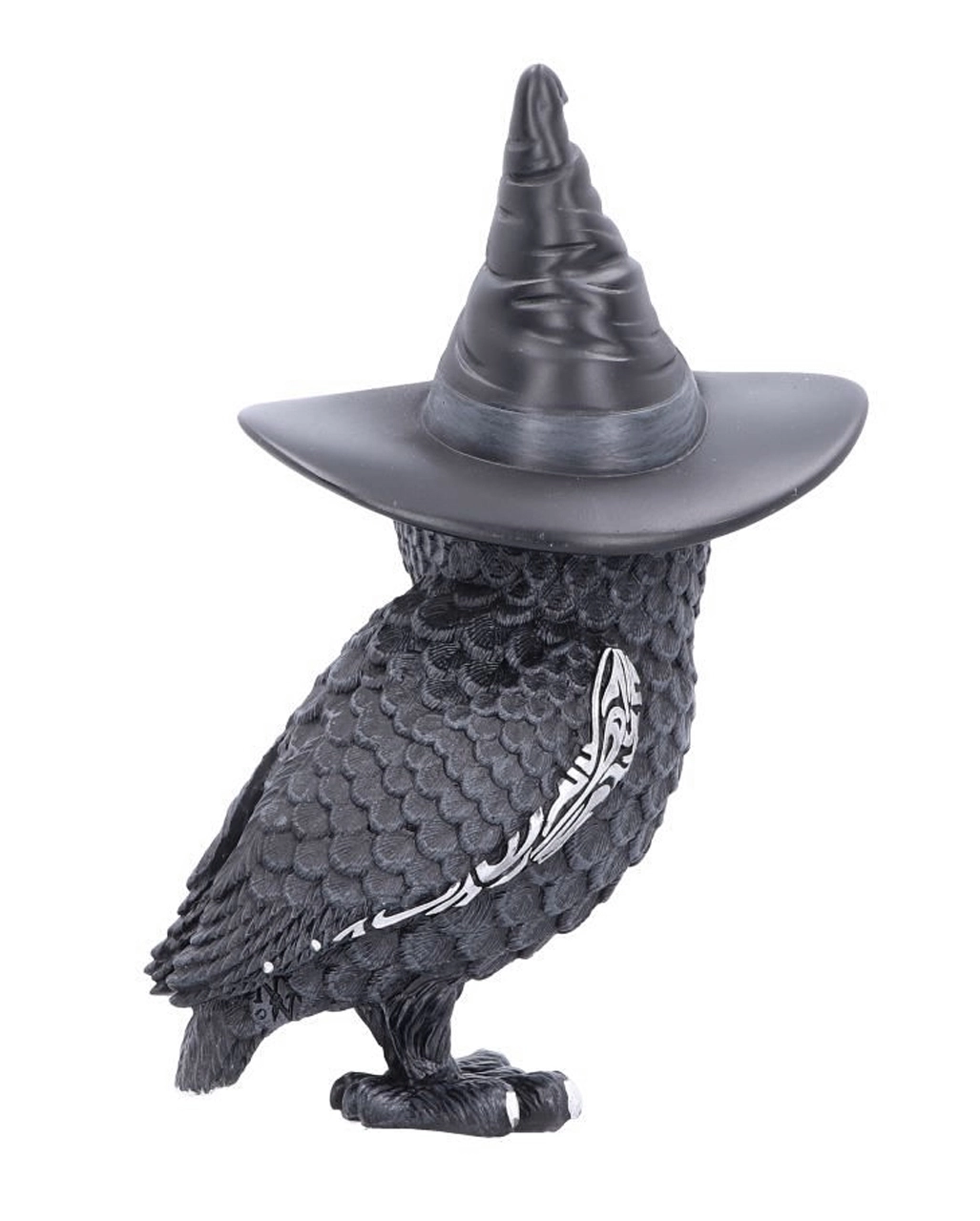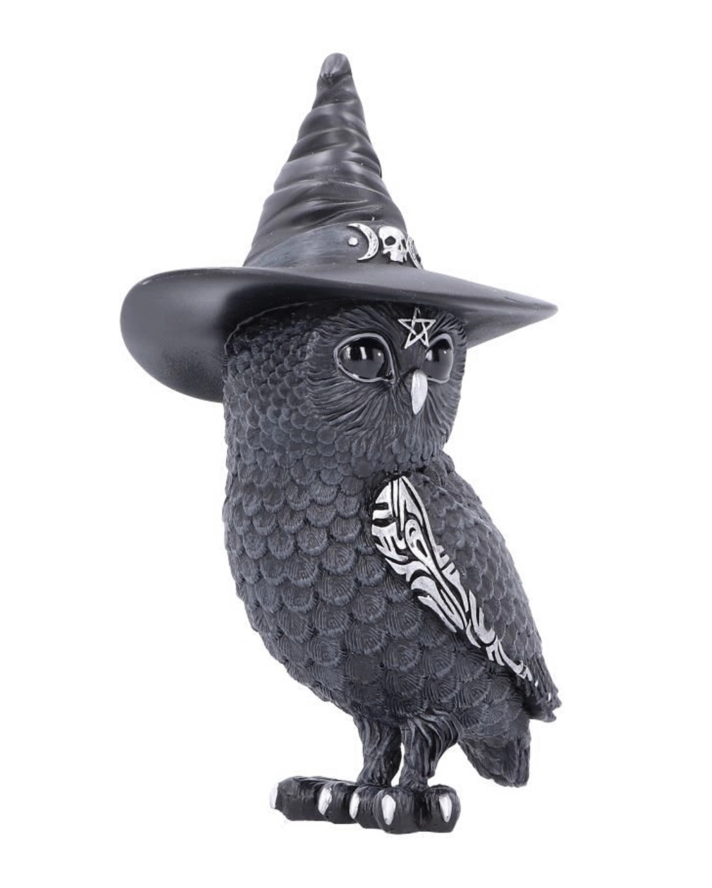 Verschenke die bezaubernde Halloween-Eule mit Hexenhut an einen Gothic Fan oder stelle sie dir als außergewöhnliche Hexen Deko auf den Tisch. Dem magischen Blick der Eulen-Figur kann man sich nur schwer entziehen. Die Hexen-Eule sieht einen aus wachen schwarzen Augen an. Die Dunkelheit scheint in ihr zu wohnen. Oder ist die Eule vielleicht die Reinkarnation einer Hexe, die in der magisch anmutenden Figur gefangen wurde? Der spitze Hut und die silberne Markierungen, die kaskadenförmig an ihren Flügeln herabfallen, lassen so etwas vermuten.
