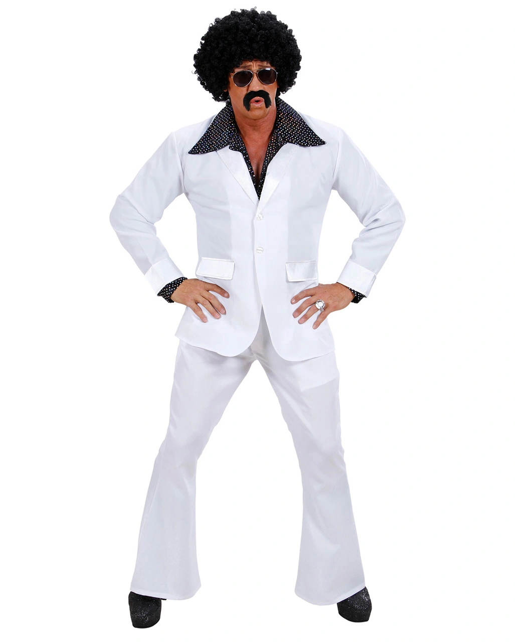 Der weiße 70´s Disco Partyanzug entspricht optisch bis ins Detail dem typischen Disco-Stil. Ein tailliert geschnittenes Jacket wirkt formgebend, während die Schlaghose des 70er-Jahre-Partyanzugs sofort dazu einlädt, die Tanzfläche zu stürmen. Dank der Farbgebung eignet sich der Karnevals-Kostümanzug genauso für Verkleidungen als Playboy, Gangster und Pimp. Dazu empfehlen wir die Disco Afro Perücke Dunkelbraun und die Blaue 70er Sonnenbrille.